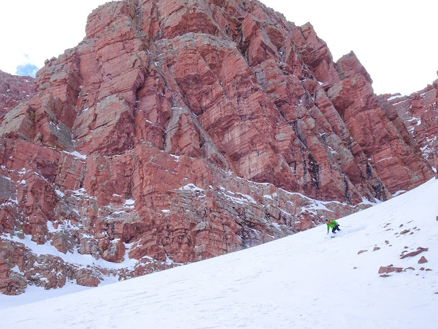 We were horrified to see that our first two choices of chutes were blown free of any substantial amount of snow. All that remained was red talus. Quite disheartened, we chalked up the day as good recon and started walking up the talus to at least gain some vert and perspective on the place. Topping out the dry chute, the mood changed in an instant as we discovered a cirque with a half dozen amazing chutes. With any sense and planning, we would have been able to discern that recent 100 + mph winds from the west would result in exactly what we accidentally discovered. Sometimes it's more fun to go in blind.